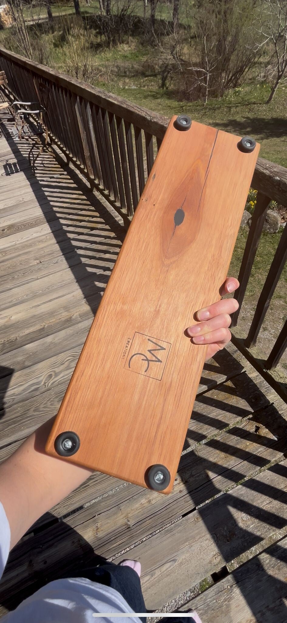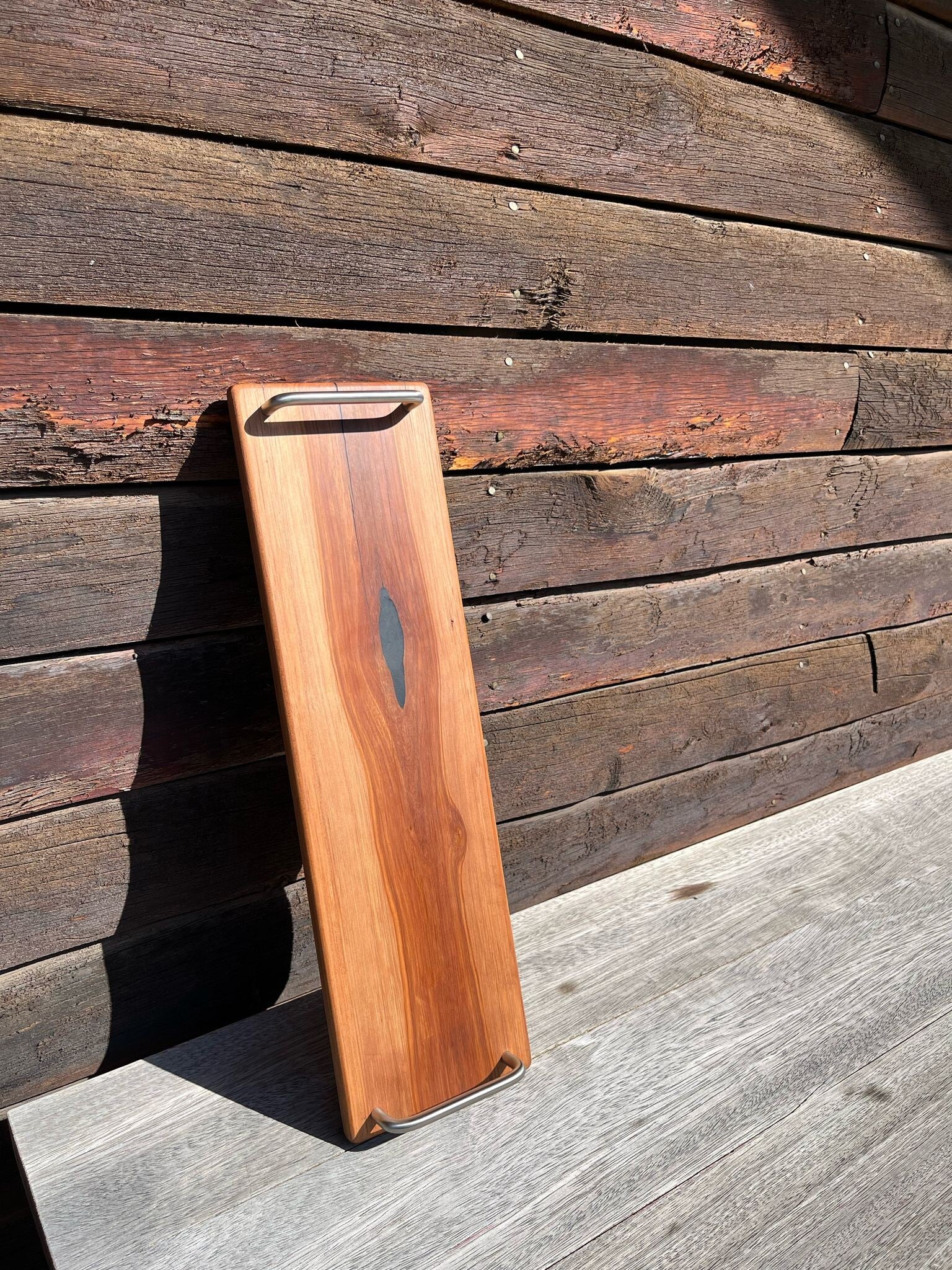 Houten kaasplank gemaakt uit palletten hardhout in combinatie met zwarte epoxy en zilveren houders